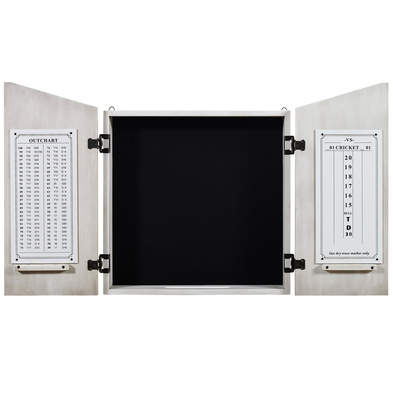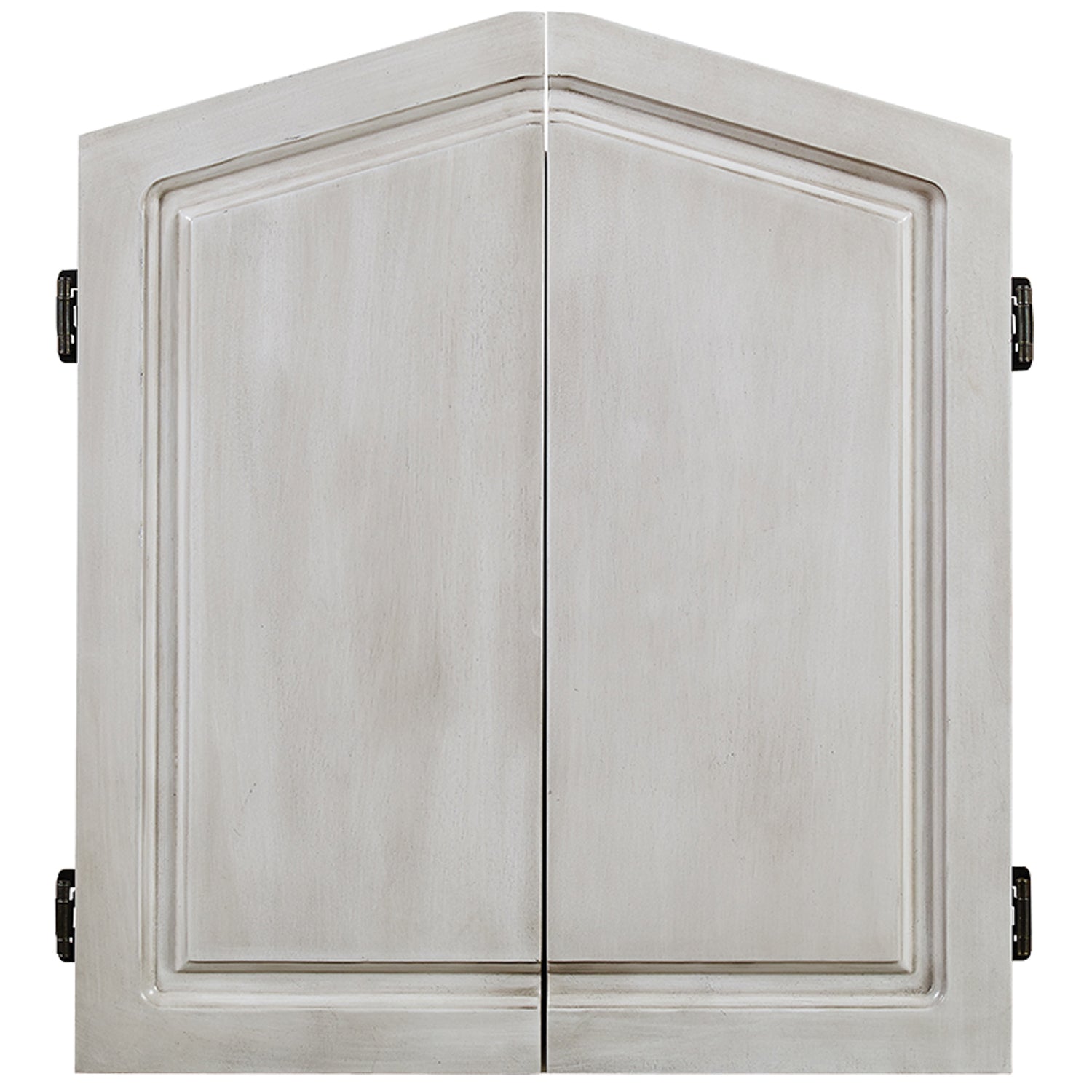 n antique white for a crisp, traditional look in any game room, this solid wood dartboard cabinet features an angular silhouette with hinged doors.