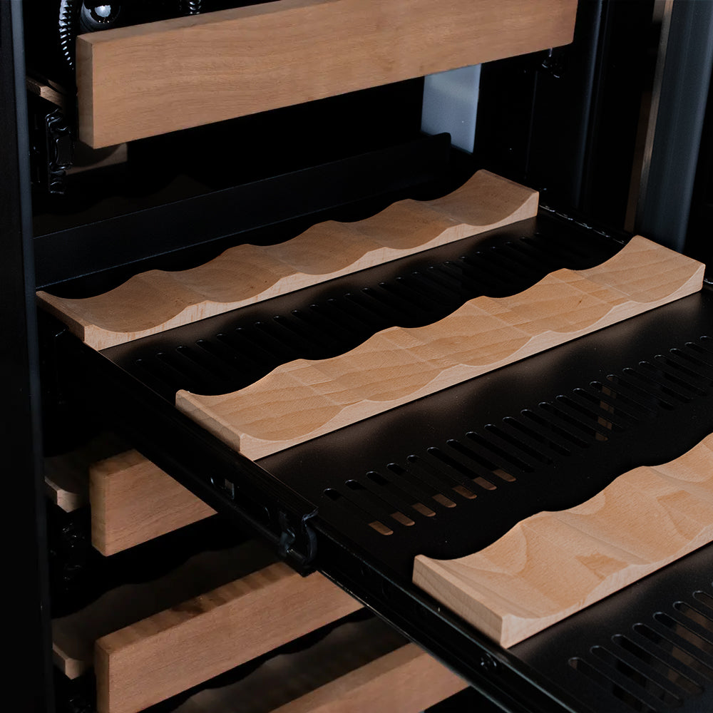 Allavino's exclusive FlexCount shelves give you ultimate flexibility and accessibility. Spacing between each shelf gives you enough clearance to not worry about racks scraping your bottle labels. Wood slats refine each shelf to cradle your wine bottles and are designed with vibration-reduction technology to prevent harmful vibrations from excessive movement and damage.