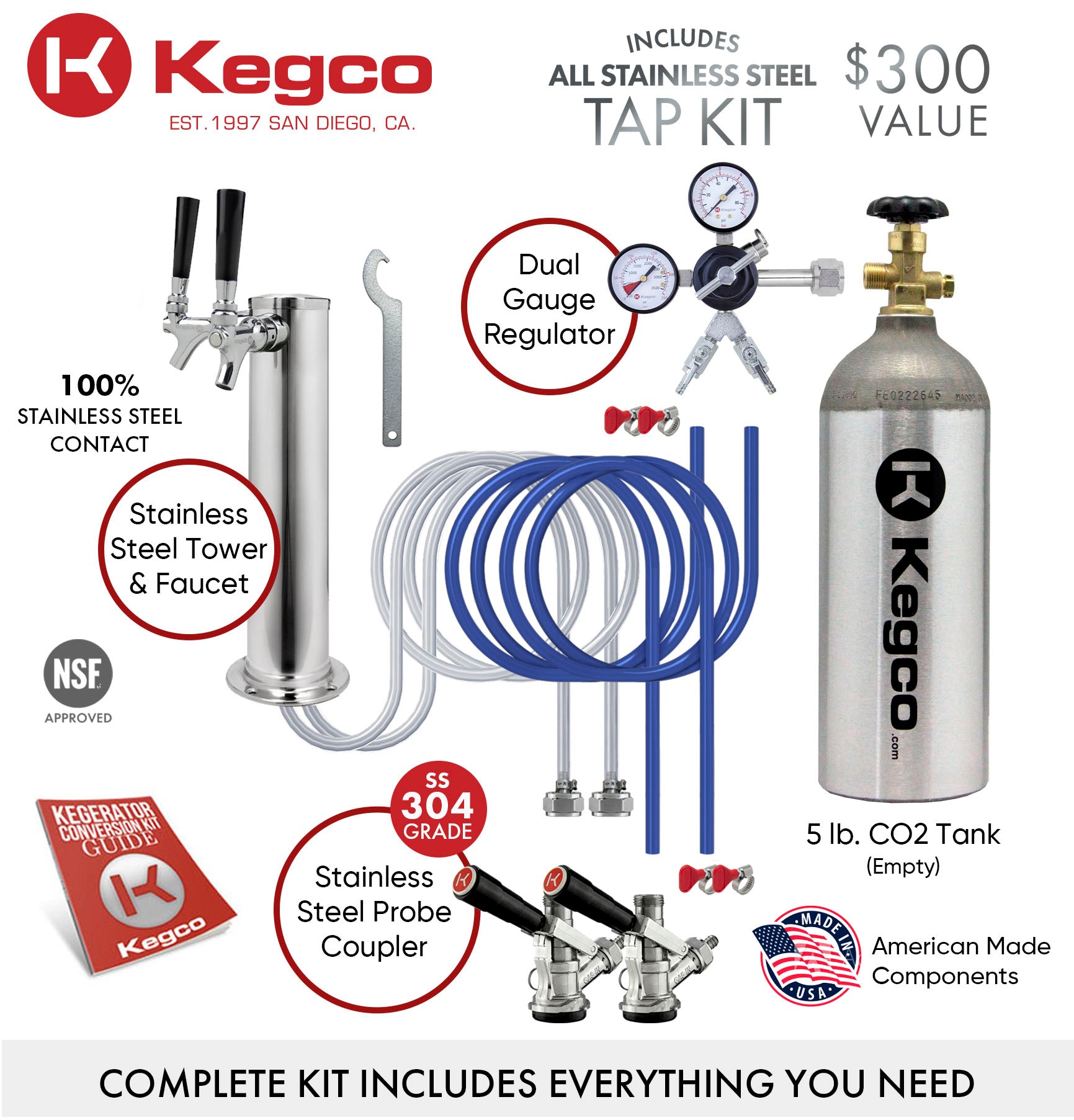 This keg beer dispenser comes with a complete dual tap draft dispense system that features 100% stainless steel contact. This kit includes a 3" diameter dual faucet polished stainless steel draft tower with two stainless steel faucets, two D system lever handle keg couplers with stainless steel probes, a commercial grade dual gauge two product CO2 regulator, and a brand new 5 lb. aluminum CO2 tank.