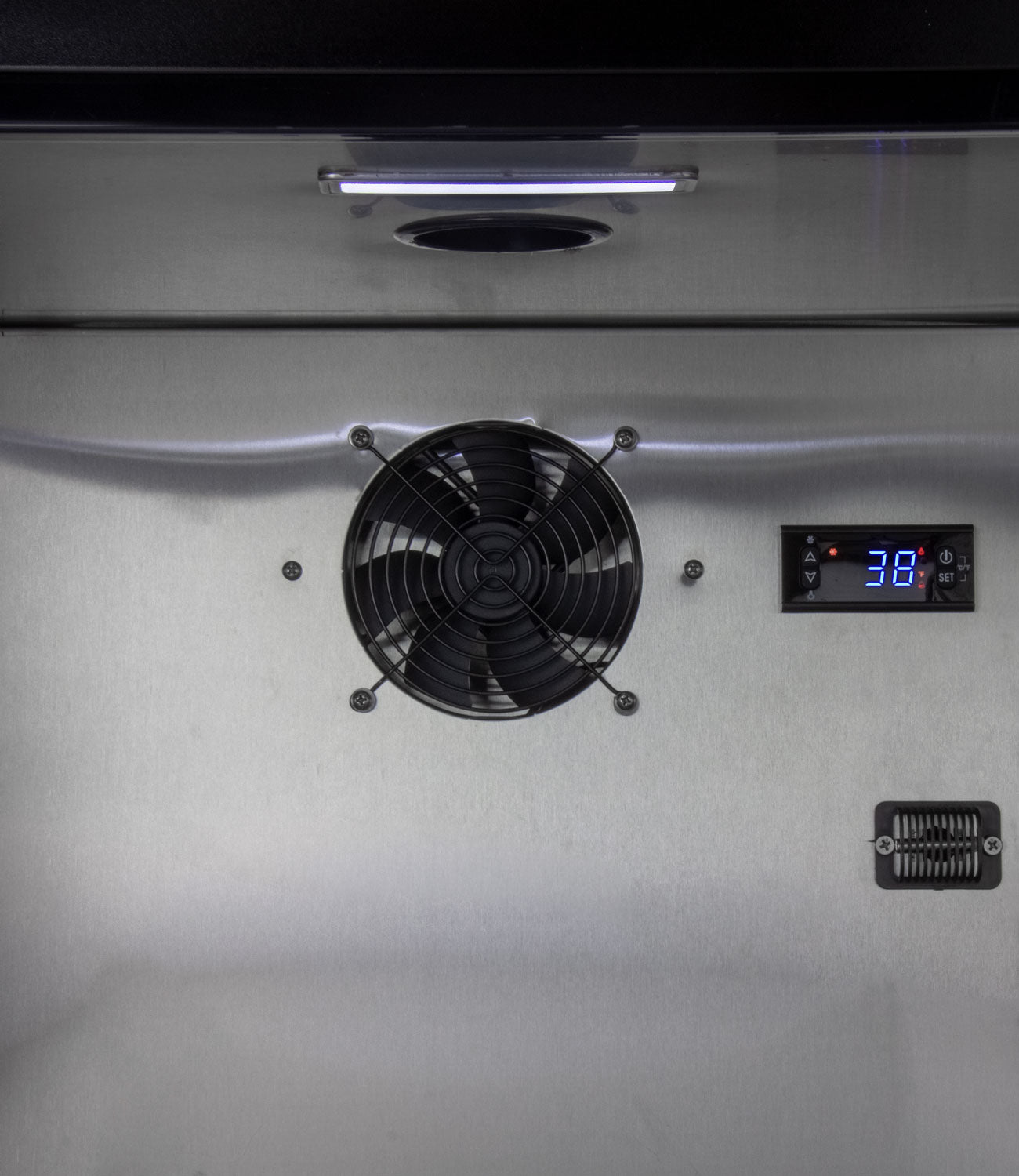 The attractive stainless steel door includes a lock to keep the contents secure. The door does not have a handle, so you don't need to worry about a handle getting in the way in built-in applications where space is tight. A door alarm will sound if the door is left open for too long.