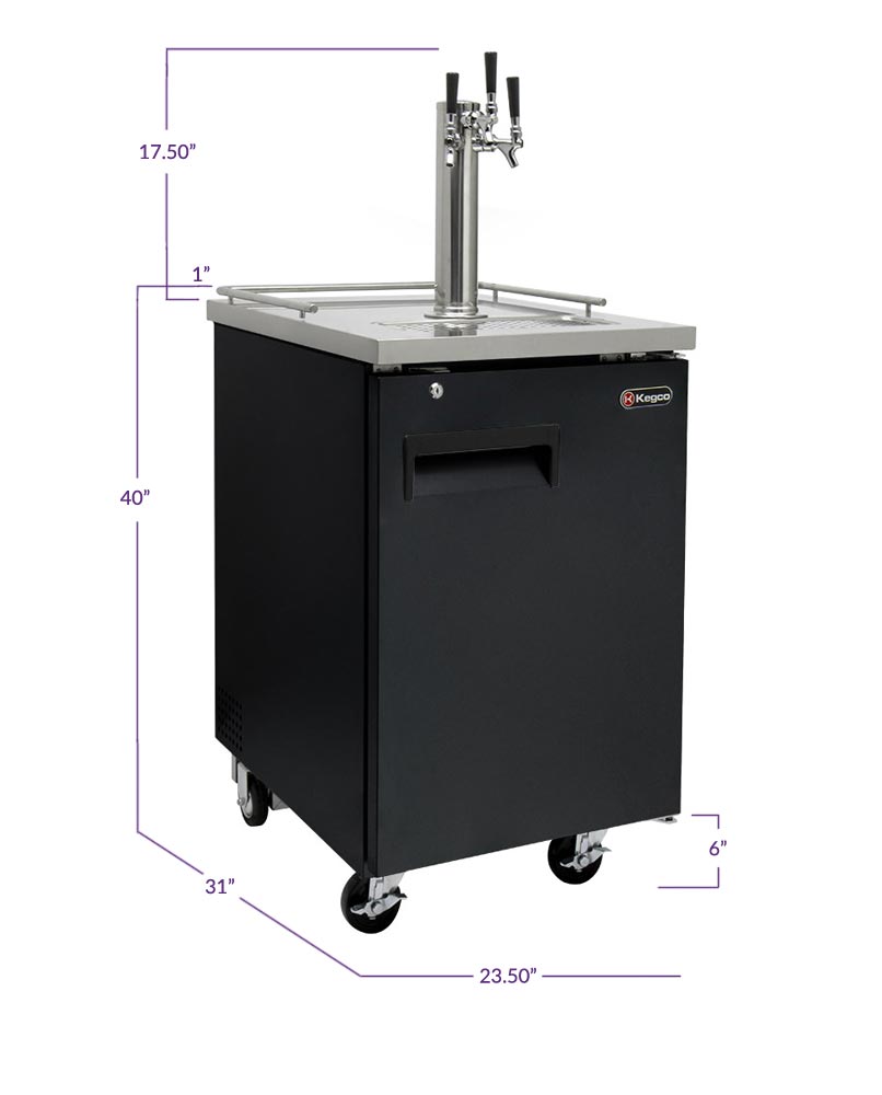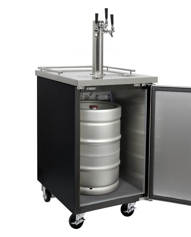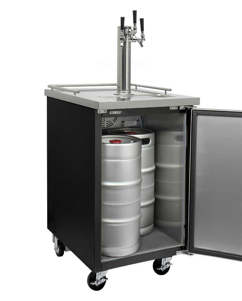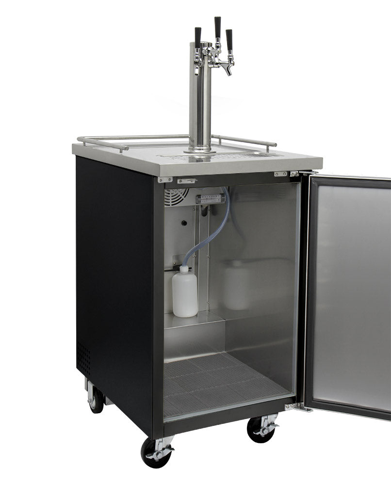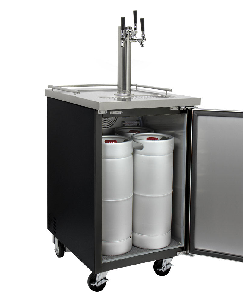The Kegco XCK-1B-3 Triple Faucet Commercial Kegerator is ideally suited for a small restaurant or wine tasting room that is looking to start dispensing multiple kegs! The interior is large enough to hold a full size keg, but it can also hold multiple smaller kegs, allowing you to offer your customers a variety of choices. Dispense two types of beer from 7.75 gallon quarter slim kegs, or a combination of beer, wine, soda and even cold brewed coffee or kombucha from up to four 5 gallon kegs. The kegerator features a knockout that allows you to place your CO2 Tank outside the unit, leaving you more room inside for kegs!